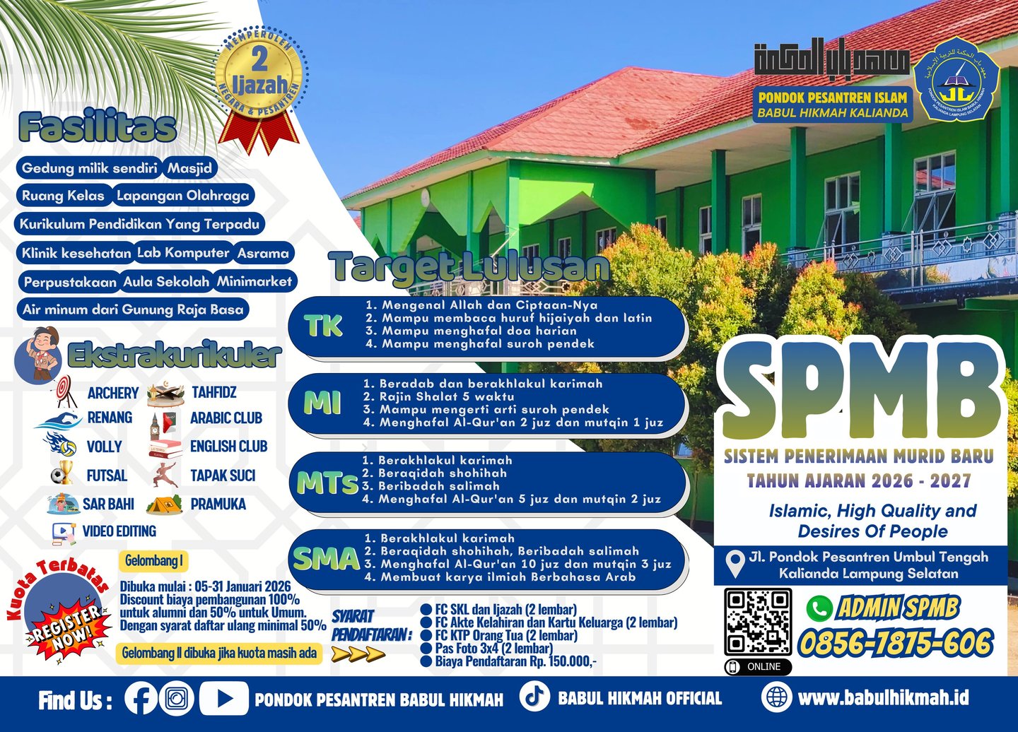 InsyaAllah Sistem Penerimaan Murid Baru Pondok Pesantren Islam Babul Hikmah akan dibuka mulai tanggal 05-31 Januari 2026 dengan sistem one day one servise. pendaftaran MI, MTs dan SMAIT terpusat di sekretariat SPMB di Gedung Utama Pondok Pesantren Islam Babul Hikmah. One Day One Servise adalah proses pendaftaran calon peserta didik yang selesai dalam sehari. Dengan alur pendaftar datang ke sekretariat SPMB membawa berkas syarat pendaftaran, kemudian proses penginputan data di formulir pendaftaran oleh panitia, calon peserta didik mengikuti tes baca Al Qur'an dan mengerjakan soal pengetahuan agama dan umum. setelah membayar biaya pendaftaran Rp. 150.000,- dan mengarjakan tes akan keluar hasil pengumuman diterima atau tidak. #BabulHikmah #PanahanSantriPutri #EkstrakurikulerBermanfaat #SantriBerprestasi