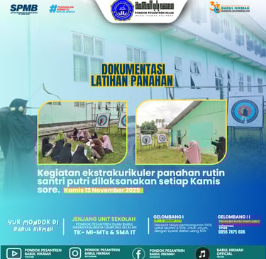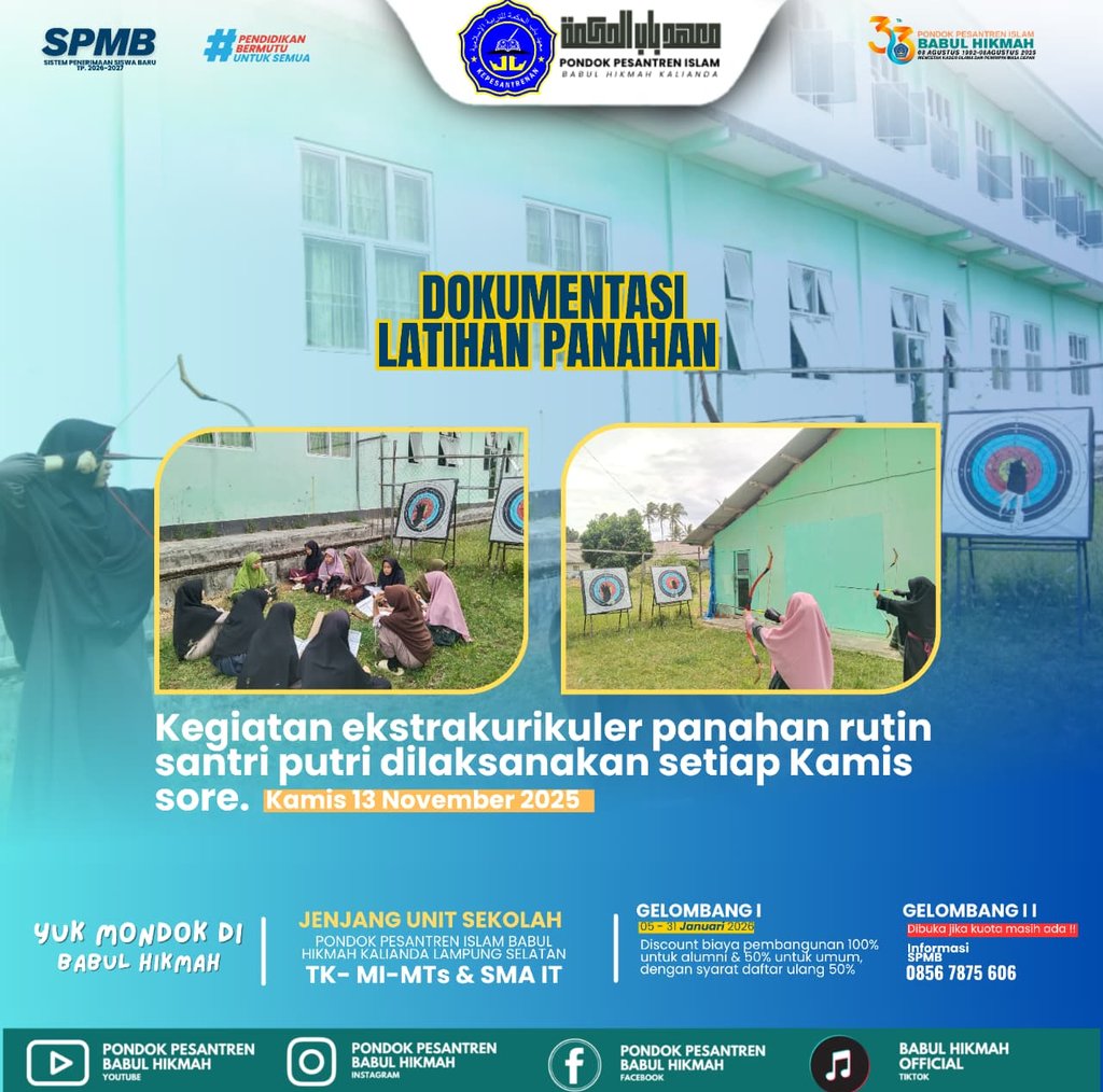 Dokumentasi Latihan Panahan Santri Putri Babul Hikmah 🌸 Semangat para santri putri Pondok Pesantren Islam Babul Hikmah dalam kegiatan ekstrakurikuler panahan yang rutin dilaksanakan setiap Kamis sore. Kegiatan ini tidak hanya melatih ketangkasan dan fokus, tetapi juga menumbuhkan nilai disiplin, kesabaran, dan kepercayaan diri. Semoga terus istiqamah dan menjadi santri yang kuat lahir batin #BabulHikmah #PanahanSantriPutri #EkstrakurikulerBermanfaat #SantriBerprestasi