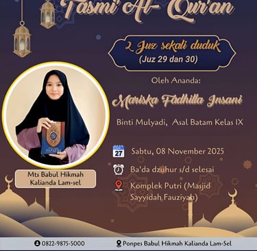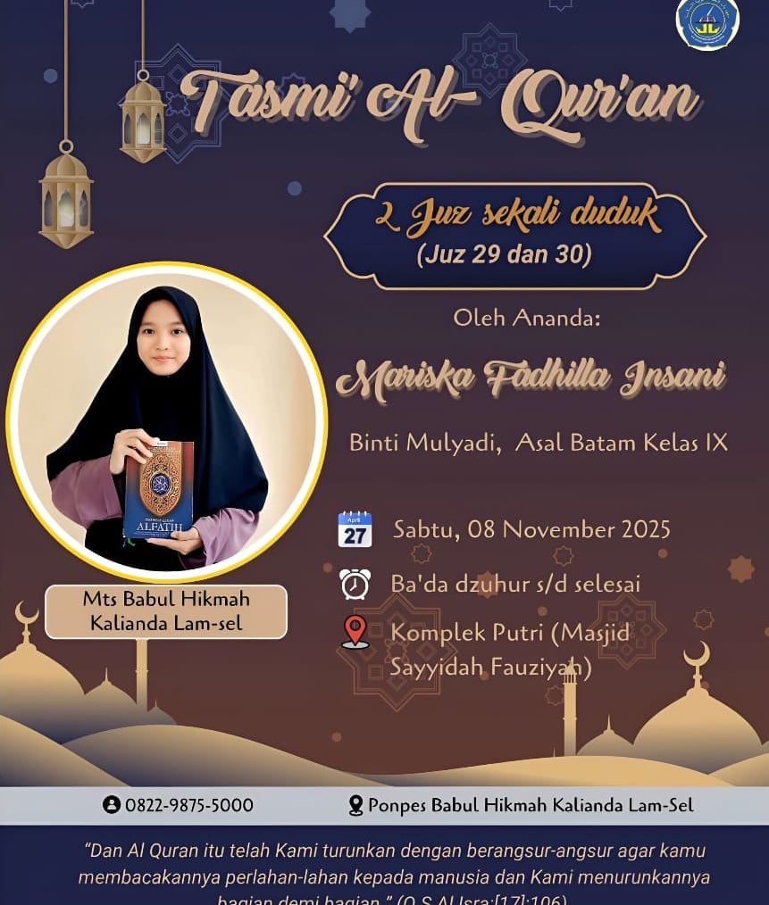 Mohon do'anya Insya Allah ananda Mariska Fadhilah Insani Binti Mulyadi kelas IX MTs Babul Hikmah asal Batam akan melaksanakan Tasmi' hafalan 2 juz Al-Qur’an Semoga keberkahan dan kemuliaan Al-Qur’an senantiasa menyertai langkah kalian, menjadi penerang hati, penguat iman, dan wasilah menuju ridha Allah SWT. Teruslah istiqamah dalam menapaki jalan para penghafal kalamullah, serta menjadi inspirasi bagi santri lainnya untuk senantiasa mencintai dan mengamalkan Al-Qur’an. 📖 “Sebaik-baik kalian adalah yang belajar Al-Qur’an dan mengajarkannya.” (HR. Bukhari) 🕌 Pondok Pesantren Islam Babul Hikmah – Kalianda 📅 Sabtu, 8 November 2025 #BabulHikmah #PanahanSantriPutra #EkstrakurikulerBermanfaat #SantriBerprestasi